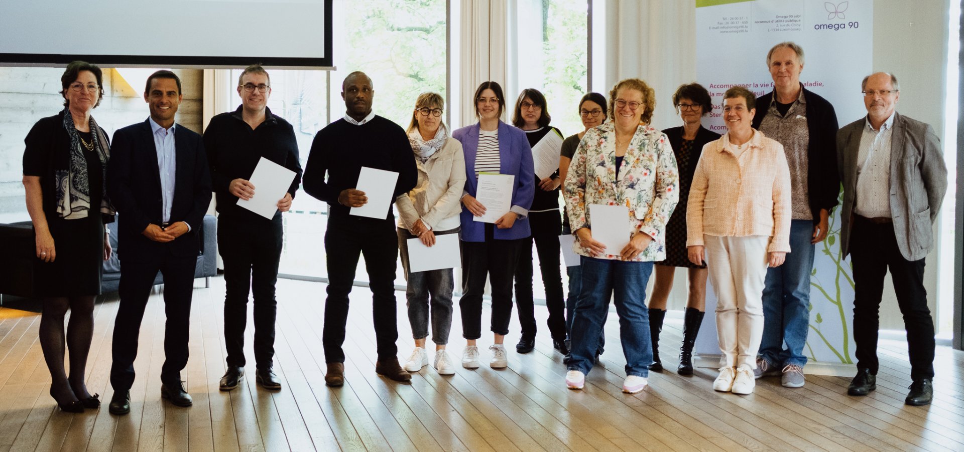Elisabeth est fier d’annoncer que plusieurs de nos collaborateurs ont récemment reçu leurs certifications Omega90 en présence de M. le Ministre Max Hahn. Cette reconnaissance, délivrée par l’association Omega90 asbl, valide les compétences et l’engagement de nos équipes dans le domaine des soins palliatifs et de l’accompagnement en fin de vie.