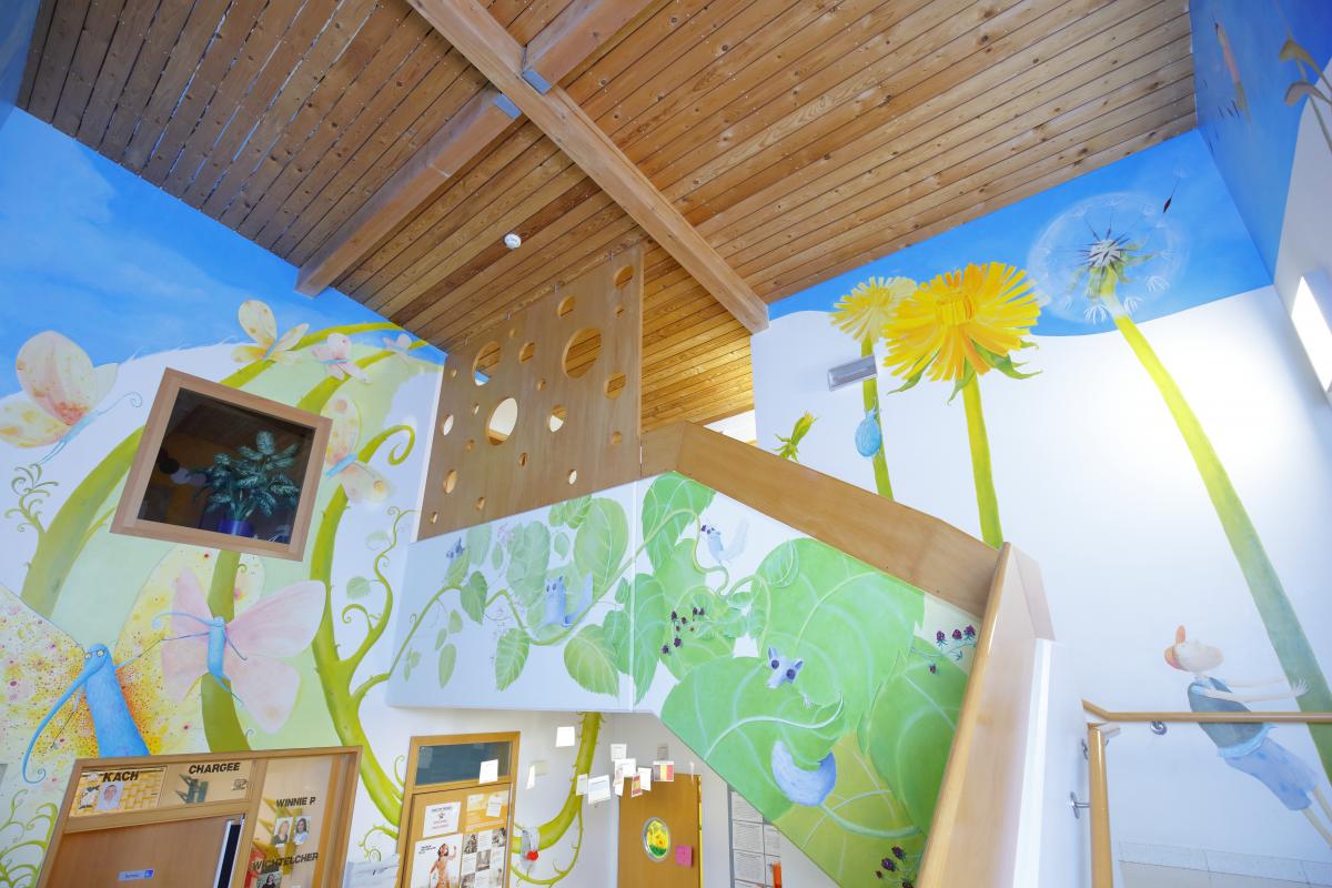 Hormis les enfants qui dorment comme des « Siweschléifer » ou des loirs, jusqu’à présent malheureusement aucun loir n’a trouvé le chemin de la crèche. Par contre, des écureuils visitent régulièrement et observent les enfants à travers les fenêtres.