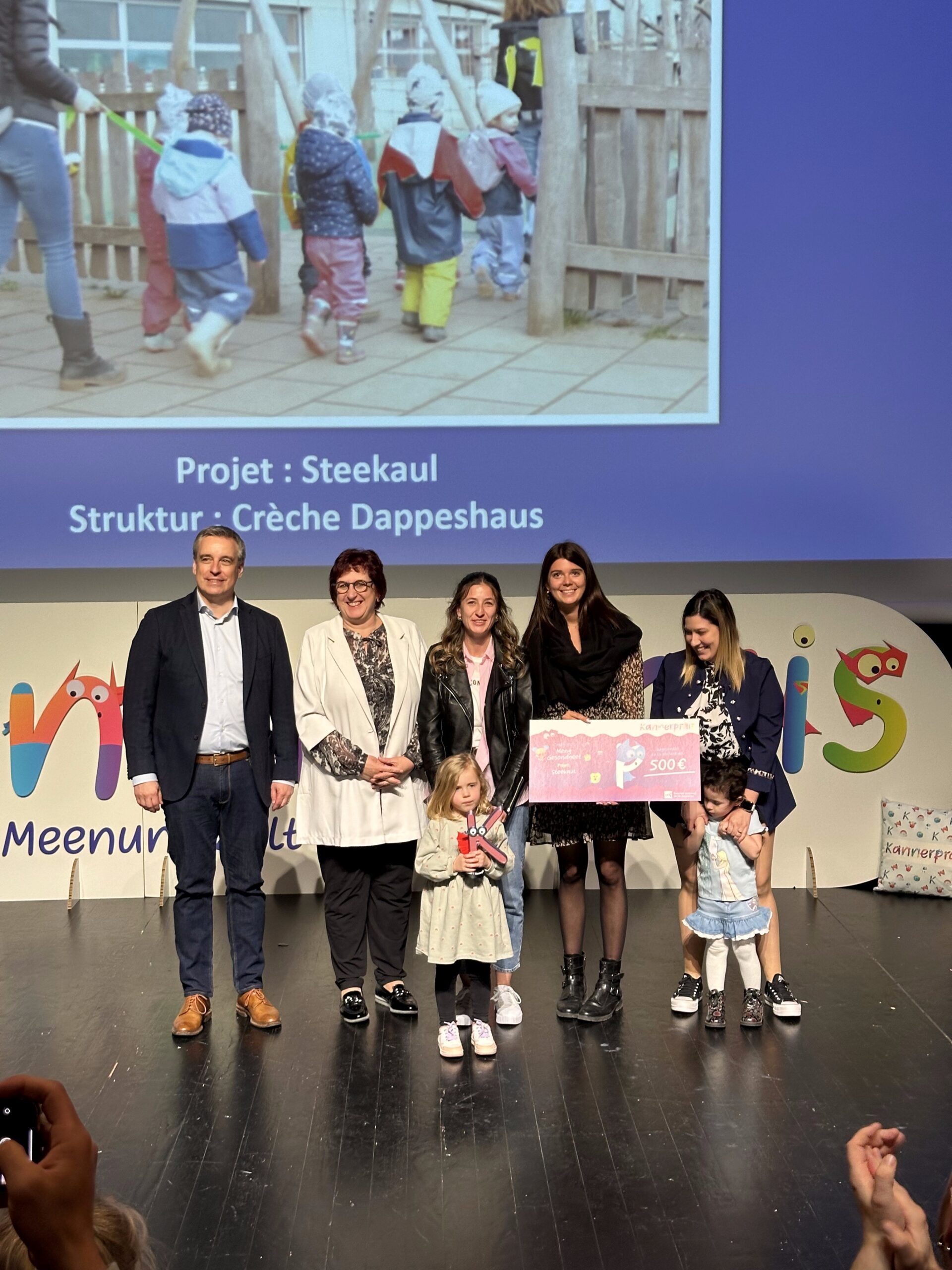 La crèche Dappeshaus à Bettendorf, l’une des 12 crèches gérées par ANNE asbl, a été récompensée lors de la première édition du Kannerpräis 2024, organisée à l’Abbaye de Neumünster. Son projet “Steekaul” a remporté le prix dans la catégorie « Ma santé », décerné à l’équipe des « Mini-Héros » (0-4 ans), en reconnaissance de son engagement exemplaire pour le bien-être et la santé des tout-petits.